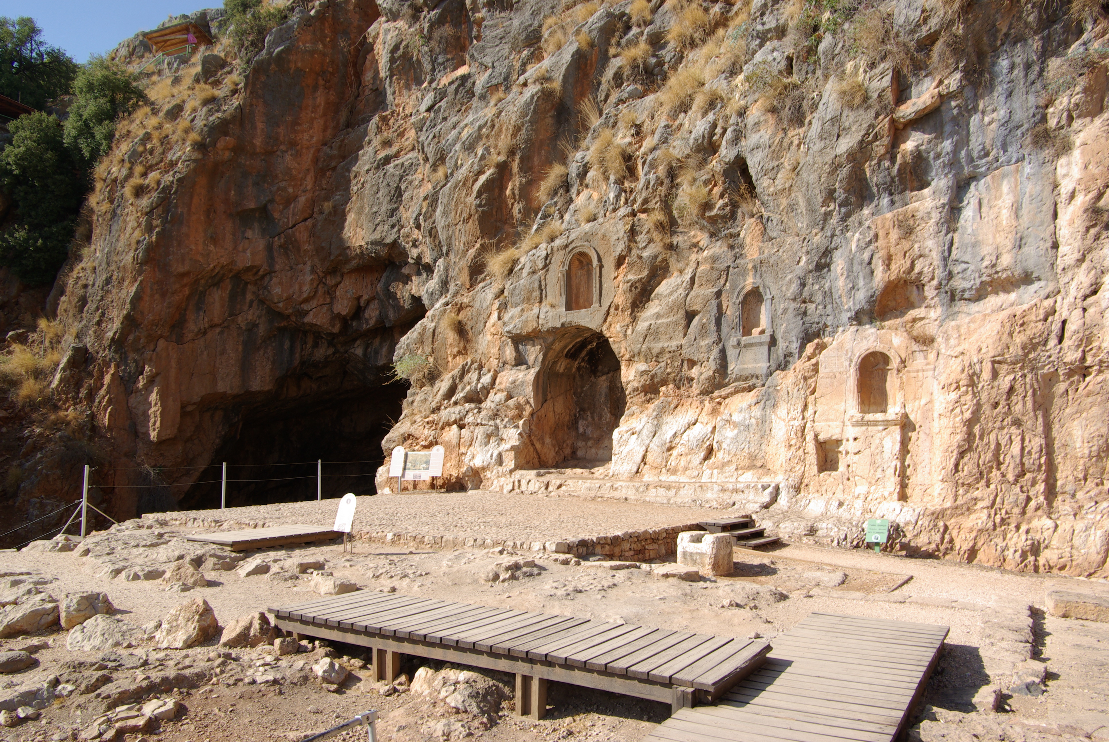 In Caesarea Philippi, there exists a gigantic rock, over 500 feet long and 200 feet high and in the back, center-left, there is a huge cave that had a deep